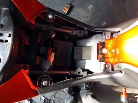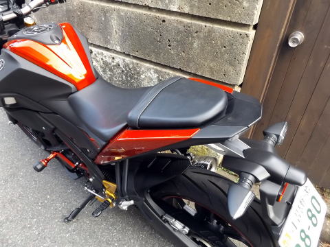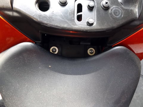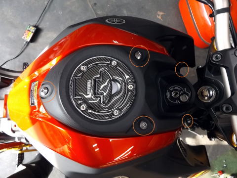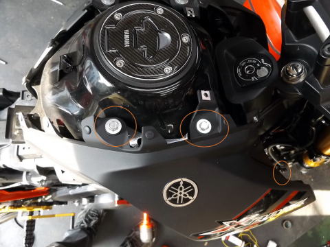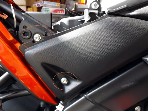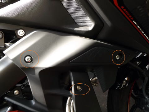 XABREのタンクカバーの外す手順 1:キーでタンデムシートを外す 2:メインシート後ろ側にあるボルト2本を外してシートを外す 3:ボルト2本を外して、サイドカバーを外す。 1箇所グロメットにささっているので、手前に抜く。前側は爪で引っ掛けてあるので、後ろ側を手前に引いて、抜く。 |