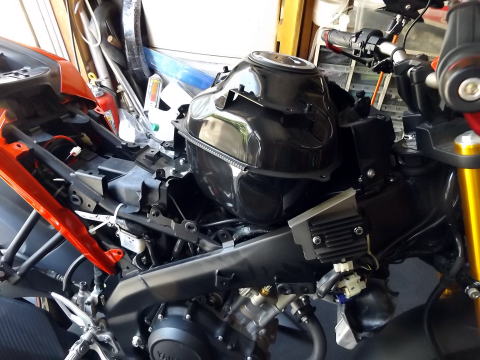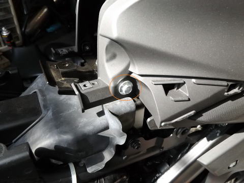 6:タンクサイドカバーを留めているボルト6本(2本はエンジンサイドカバーの裏に隠れている)をはずしてカバーを外す。 先にアンダーカウル、エンジン部のサイドカウルを外してからのほうが作業性はいいのですが、ずらして作業しています。 これで右側が外れました。 ラジエターキャップは右側を外せば、アクセスできます。 同じように、左側も同様に外します。 |
