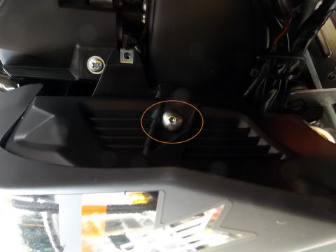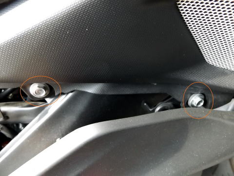 4:下側のサイドカバーのボルト2本を外して、カバーを外す。前側はグロメットで留まっていますので、手前に引きます。 |